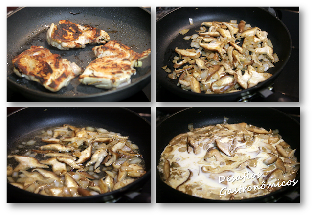 Na geladeira, uma bandeja de shitakes frescos (não utilizados no final de semana), uma garrafa de vinho branco não terminado e um pouco de creme de leite fresco, me inspiraram a fazer um molho diferente para o frango. Depois marinar o frango em um pouco de vinho e alecrim (o pessoal aqui em casa brinca que tudo que é "gourmet" leva alecrim!! rs), grelhei as sobrecoxas (sem nenhuma gordura, só a gordura do próprio frango) e preparei o molho na própria frigideira.
