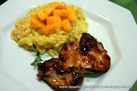 Frango ao Molho de Laranja e Risotto de Curry com Manga Flambada