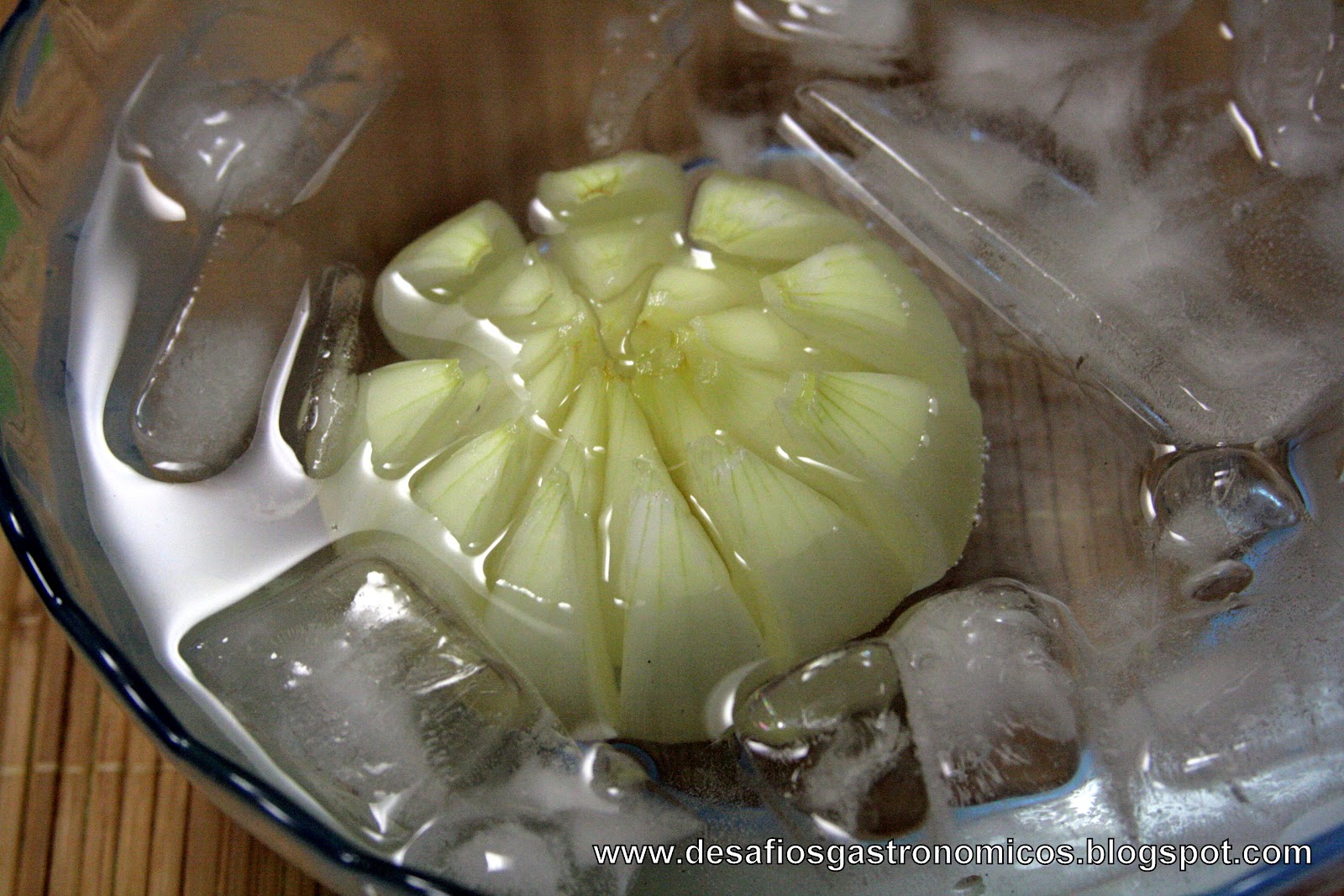 Coloque em uma travessa de água com gelo e deixe a cebola mergulhada por duas horas.