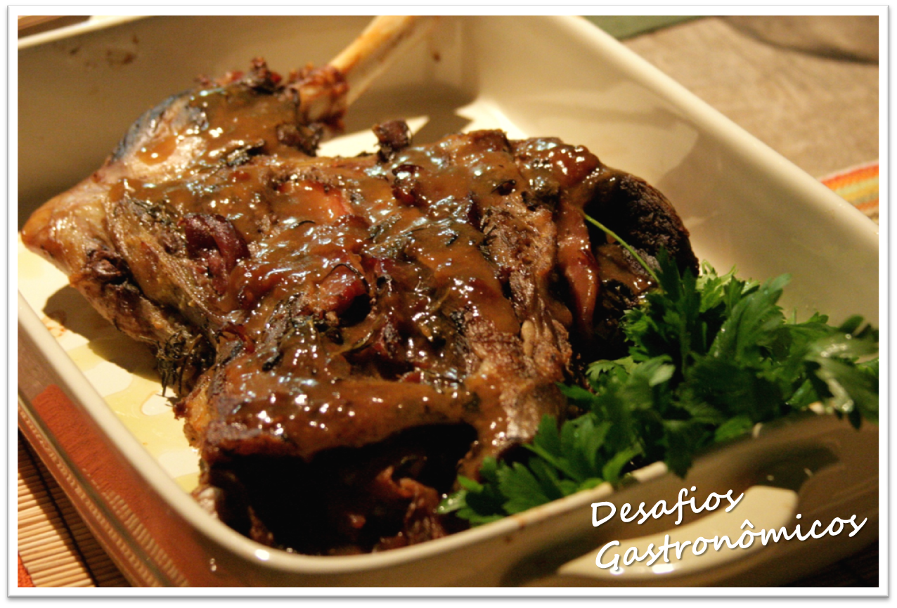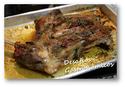 Escolhi uma receita que levava Panchetta (substituída sem prejuízos pelo bacon), Limão Siciliano, Sálvia e Alecrim frescos! Descongelei a paleta na geladeira por 24 horas e, no dia anterior, resolvi assar a paleta (pois o dia do evento seria agitado, com a visita da minha afilhada Paula). Fiz exatamente como mandava a receita do Jamie Oliver. Optei por deixá-la "ao ponto para bem passada" ficando 1h e meia no forno. Também coloquei um papel alumínio na primeira hora, para garantir um cozimento mais lento e sem ressecar a carne. Depois que estava assada, reservei o molho da assadeira e, no dia seguinte, retirei toda a gordura e preparei um molho engrossado com maisena, que finalizou lindamente o prato, que só foi esquentado no forno por uns 30 minutos (com papel alumínio novamente).