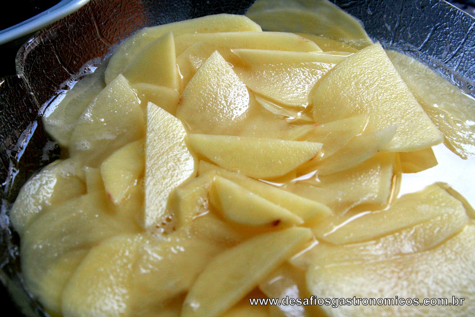 Prepare as batatas: descasque e corte em fatias bem finas, deixando de molho para que não escureçam. Reserve.
