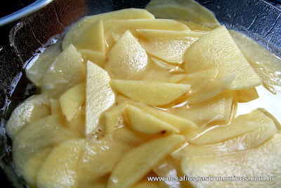 Procurei na internet e achei uma receita bem explicada e simples no  blog Figos & Funghis . Eu imaginava que as batatas deveriam ser cozidas ou escaldadas antes de ir ao forno, mas não era necessário, desde que fossem cortadas bem fininhas. O preparo é simples, mas deve ser feito com antecedência de umas duas horas (eu acabei servindo o almoço às 2 horas da tarde, mas valeu a pena!). Outro ingrediente importantíssimo é o alecrim, que dá um sabor especial ao prato... E eu quase esqueci o coitado! Lembrei quando já havia colocado as batatas no forno! Corri na minha hortinha e rapidamente joguei a erva por cima do prato! Ufa!!
