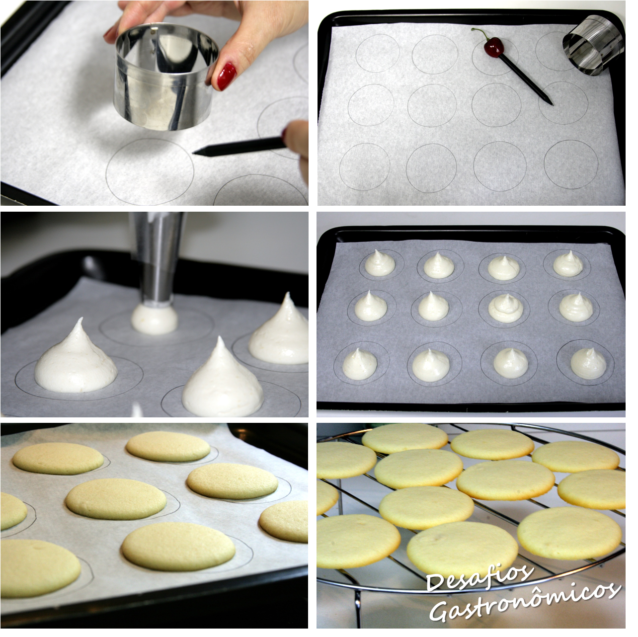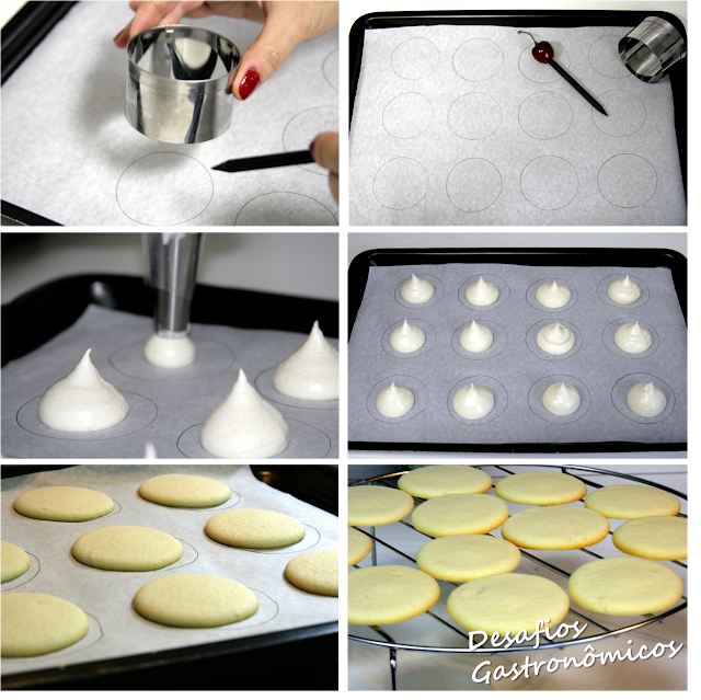 biscoito, forrando com papel manteiga. Em cada folha, faça 12 círculos de cerca de 4cm de diâmetro. Aqueça