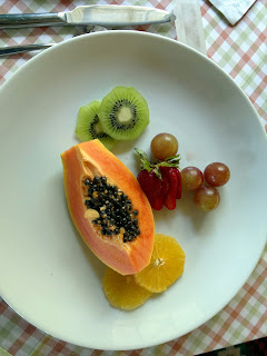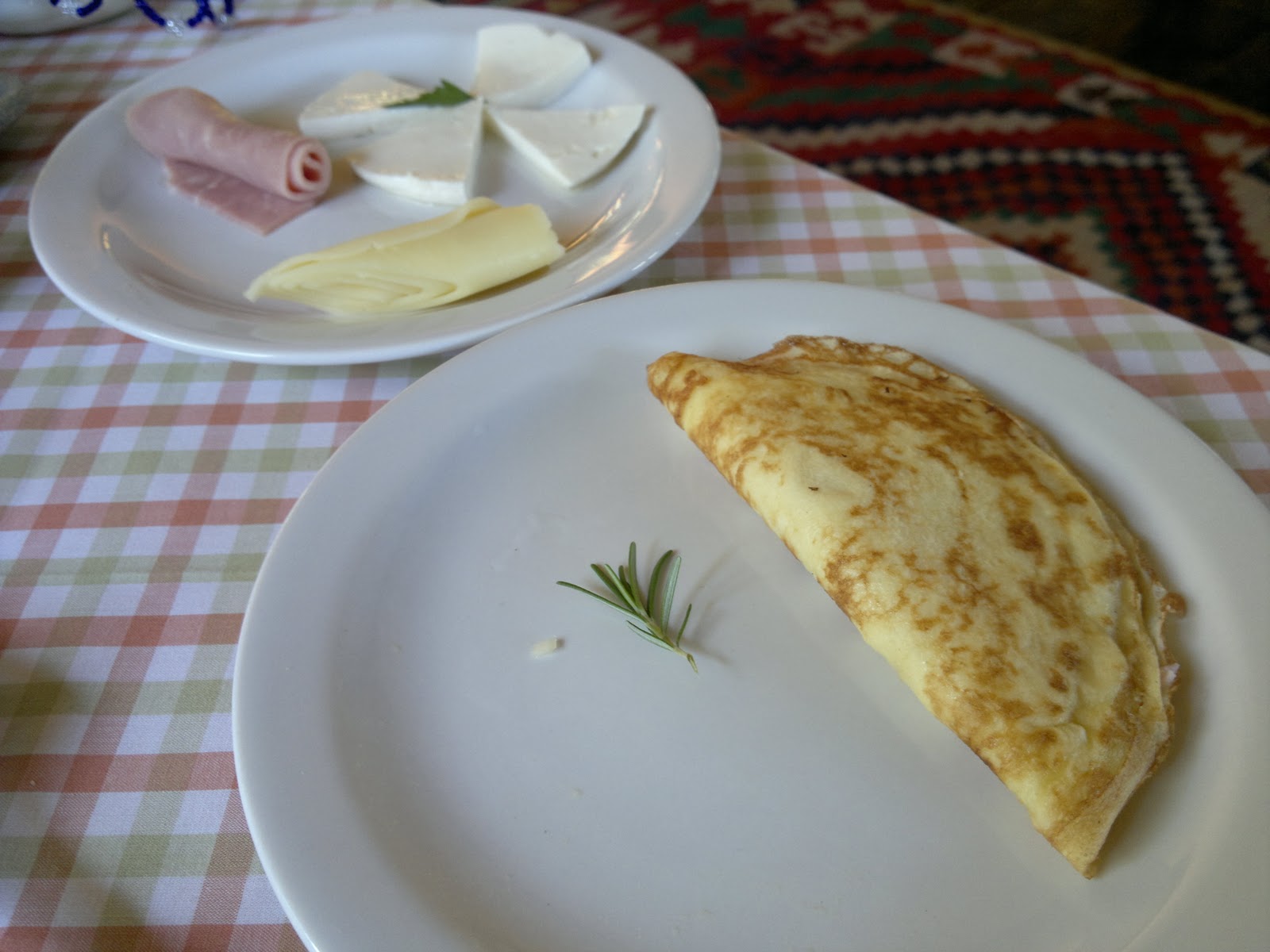 O Alê, ainda se sentindo ameaçado pelas empadas assassinas, não aproveitou muito o café da manhã! Uma pena, porque estava bem gostoso! Um Buffet com pães e bolos caseiros, frutas, sucos naturais, coalhada deliciosa, canjica... E um cardápio de opções como ovos, omeletes, crepes, panquecas, rabanadas...