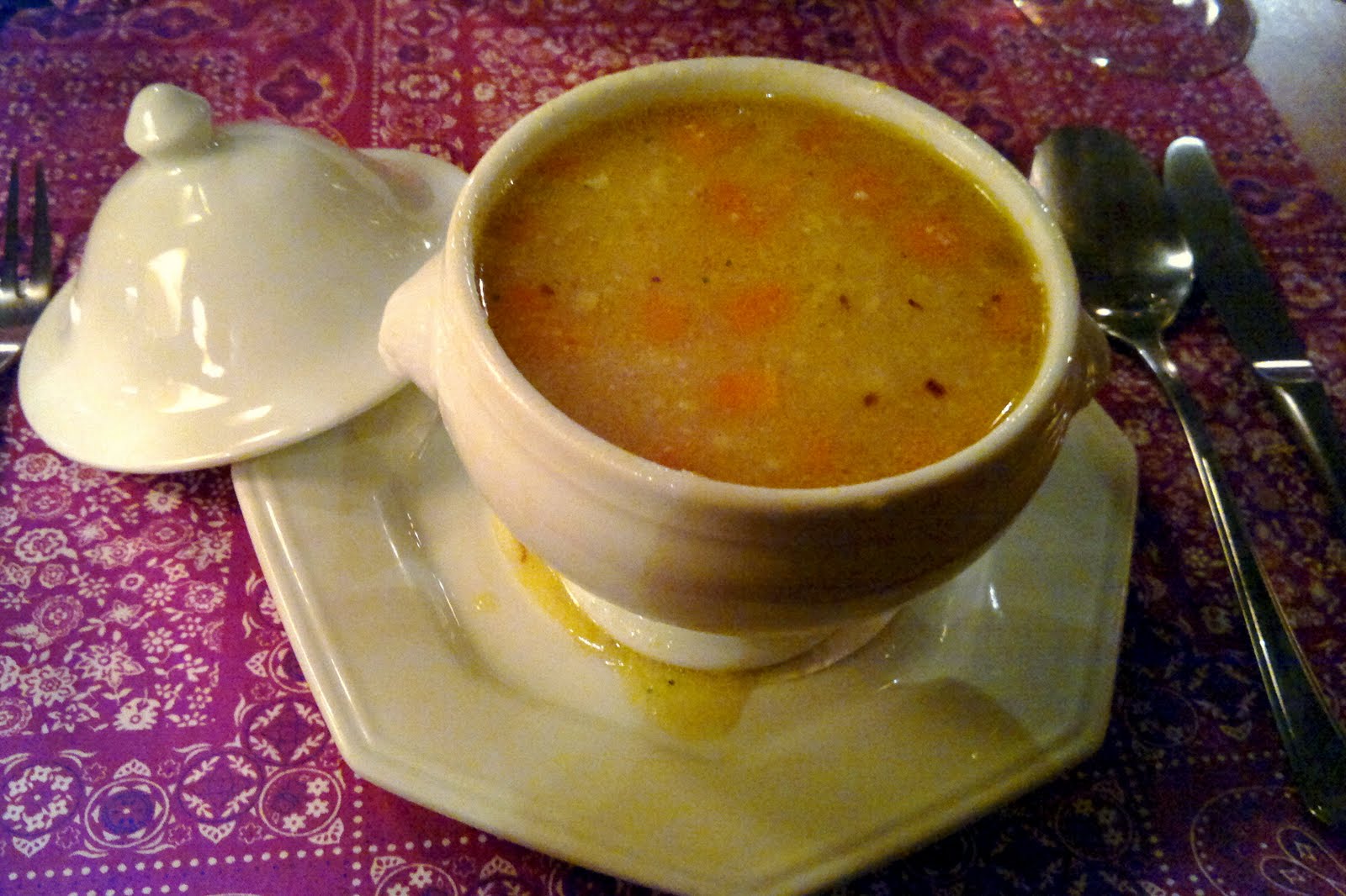 Nosso pedido foi frugal: Sopa de Cebola (para mim), Canja (para o Alê). Infelizmente as sopas decepcionaram... A de cebola tinha um sabor forte de queimado por conta de um pedaço de mussarela gratinado além da conta e a canja parecia sopa de pacotinho, com arroz quebrado, duro e frango “ralado”! Fiquei com saudade da minha sopa de cebola e da Canja que fiz recentemente... rs
