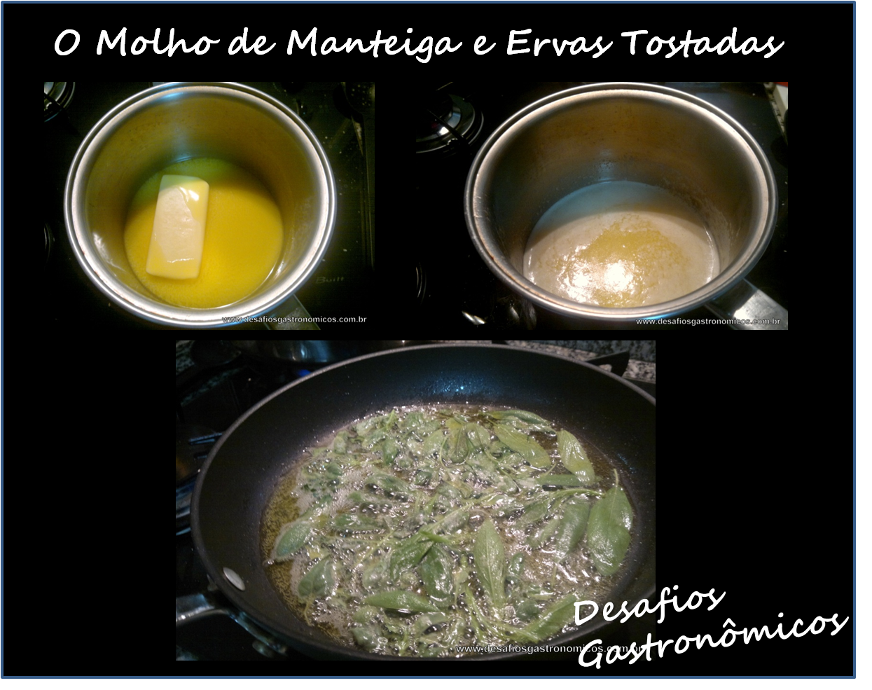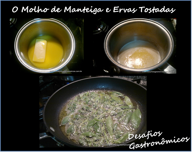 Por ser suave e, ao mesmo tempo, cheio de personalidade, o sabor do recheio de abóbora pede um molho também suave, que não "brigue" com a leveza da abóbora e da massa com semolina. Lembrei-me então do Molho de Manteiga com Ervas Tostadas que combinei com um Tortellini de Vitela! Perfeito!! O "truque" deste molho é clarificar a manteiga (retirando impurezas e resíduos lácteos) para que se possa fritar as ervas até ficarem crocantes, sem deixar a manteiga escura!