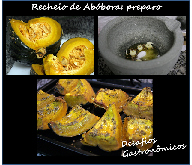 Prepare a abóbora: Corte a abóbora em pedaços grandes, com casca. Triture todos os demais ingredientes e forme uma pasta de temperos. Passe esta pasta pelos pedaços de abóbora e leve ao forno por 40 a 45 minutos ou até os pedaços de abóbora estarem macios. Retire as cascas e amasse a polpa com um garfo, até transformar em um purê. Reserve.
